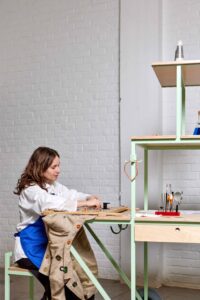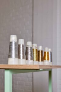 Bring your own worn-out clothes or accessories to MoMu and have them transformed into a wearable work of art, giving them a new life! In her nomadic repair studio – which combines embroidery and goldsmithing – Anneleen repairs items with customised embroidery decorations made from precious metals. Two handmade silver labels mark the garment with the embossed name of the reparation, carefully hand-stitched.