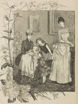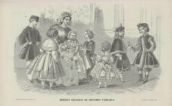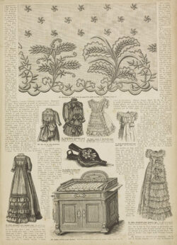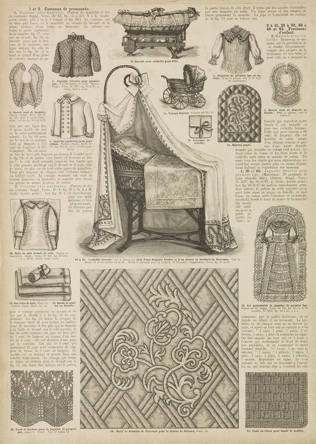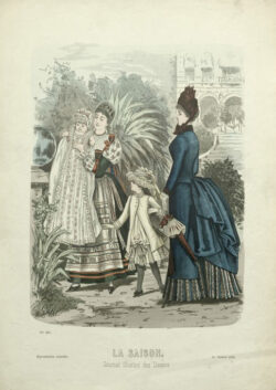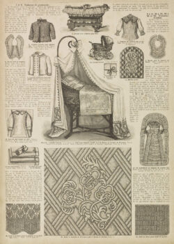 After 1870, christening and baby gowns appear with increasing frequency in fashion magazines. For instance, in its 16 February 1885 issue, La Saison published a veritable baby special, devoting four pages to christening gowns and children’s clothing. The magazine also introduced the new combination of christening gown and padded baby carrier, which appears to merge the historical bearing cloth with the christening gown. This issue illustrates not only the growing range and variation of such garments, but also the increasing focus on babies and young children during this period. As early as January 1872, Le Journal des Demoiselles was already commenting on the allure of Parisian magasins de lingerie pour bébés and warning of the temptation to spend excessively on fripperies for one’s mon cher trésor.