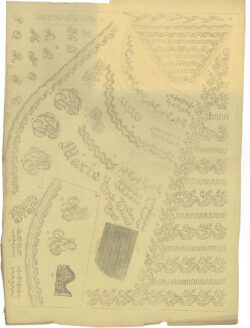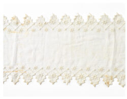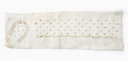 For christening gowns and matching bonnets, linen seamstresses often used fabric, ribbons, and inserts that had been pre-embroidered by professional embroiderers working from home. Some christening and baby gowns are veritable puzzles, skilfully cut and artfully assembled from ribbons and inserts. Expectant and young mothers could also sew christening or baby gowns themselves. Learning to sew was a key part of girls’ education, and sewing samplers demonstrate the fine needlework also seen in baby gowns. Occasionally, fashion magazines provided patterns for christening and baby gowns. Fabric and ribbons could be purchased in fashion boutiques and department stores.