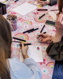 A group of parents and children are engaged in creative activities at a colorful table in the hall of a museum.