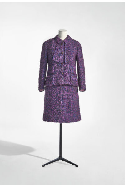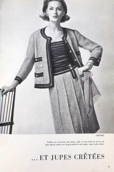 Eind jaren 1910 introduceerde Gabrielle ‘Coco’ Chanel (1883-1971) het mantelpak als alternatief voor de strak gekorsetteerde japonnen. Geïnspireerd door mannenkledij hadden haar vroege ontwerpen een kraagloos jasje en een smalle rok. Chanel werkte vaak in tweed, een stof die typisch was voor herenkledij. Haar mantelpak bood vrouwen een comfortabel, maar modieus silhouet, aangepast aan een actiever leven. Chanels mantelpakjes uit het midden van de jaren 1950 groeiden uit tot een internationaal mode-icoon. Hoog uitgesneden armsgaten en de lichte en soepele tweed maakten het mantelpak aangenaam om te dragen. Door subtiel te variëren met kleuren, knopen, strikken of plastrons bleef het ensemble telkens fris en eigentijds.