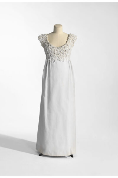 Het vierde stuk dat koningin Paola aan MoMu schonk, is een avondjurk van het modehuis Valentino. Als Italiaanse koos zij regelmatig voor Italiaanse ontwerpers. In mei 1966 bracht de Britse koningin Elizabeth II een officieel staatsbezoek aan België. Tijdens het staatsbanket droeg prinses Paola een haute couture japon van Valentino uit de lente-zomercollectie van 1966. De mouwloze japon van witte zijde heeft een empire silhouet. Paola combineerde de japon met de art-decotiara van koningin Elisabeth, vermoedelijk ontworpen door Cartier, en diamanten oorbellen met parels van juwelier Altenloh. Witte, lange zijden handschoenen, een diamanten collier en een goudkleurig avondtasje vervolledigden het ensemble. De prinses droeg de japon een tweede keer naar het galabal ter ere van de 75ste verjaardag van de Belgische Kamer van Koophandel in Londen.