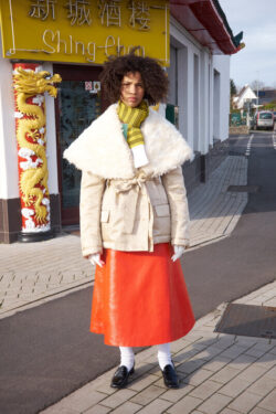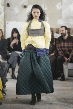 Voor de herfst-wintercollectie 2023-24, The Holiday Album, keek Meryll Rogge naar typische kerstportretten en eindejaarsclichés uit haar eigen jeugd. Met een flinke dosis humor – zoals de overal aanwezige kerstrozen – verweefde ze deze nostalgische verwijzingen doorheen haar ontwerpen.