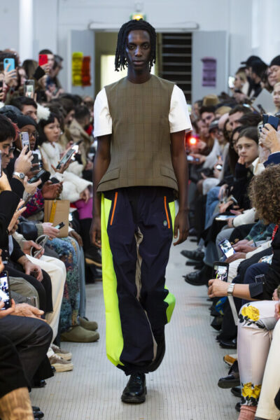 Meryll Rogge bedenkt zowel mannen- als vrouwensilhouetten en speelt graag met de klassieke codes uit de herengarderobe. Hierbij blijft ze trouw aan de vormen die eigen zijn aan het mannen- en vrouwenlichaam. Wat op het eerste gezicht een trainingsbroek lijkt, is een elegante smokingbroek (herfst-winter 2021-22). Een geruite wollen top met twee klepzakken verwijst dan weer naar een herenblazer (herfst-winter 2024-25).